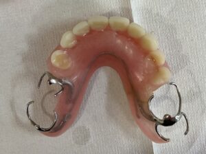 保険の入れ歯で補強する材料は、ピンクの中で透けてみえる細いワイヤーです。
